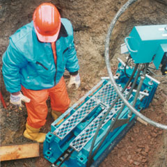 neue PE-Rohre in die vorhandenen eingezogen. Das alte Rohr wird dazu zunächst aufgeschnitten und zur Seite gedrängt.